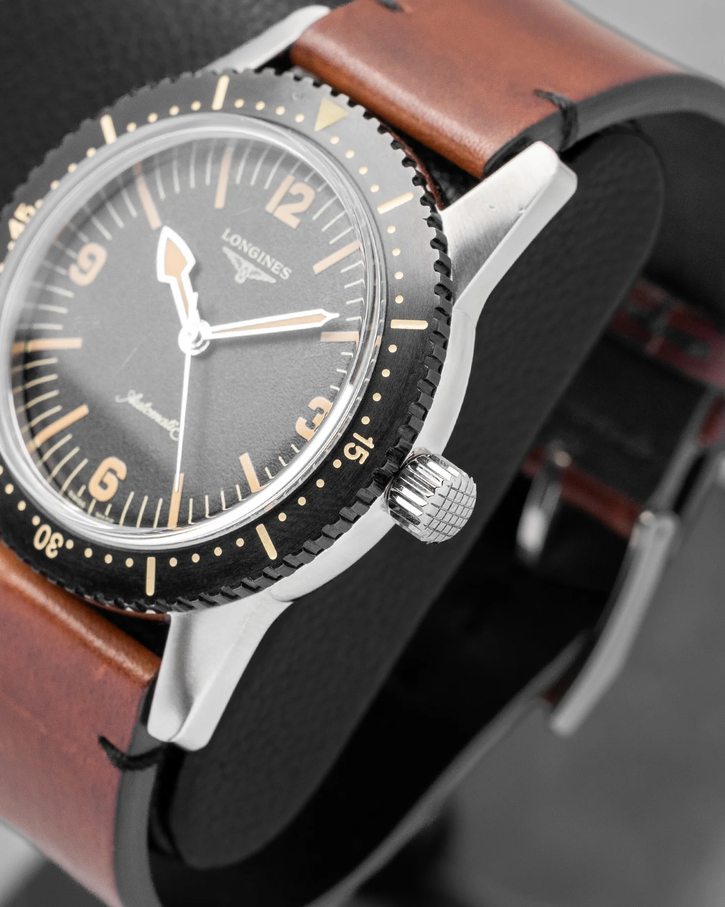 Dive into retro-inspired design with the Longines Skin Diver. Its 42mm stainless steel case and black PVD-coated unidirectional bezel frame a black grained dial with luminous beige silver-tone hands and vintage-style hour markers. Paired with a supple brown leather strap, it’s an effortless blend of rugged and refined. Powered by the caliber L888 automatic movement with up to a 72-hour power reserve. This sport watch blends heritage and modern versatility.