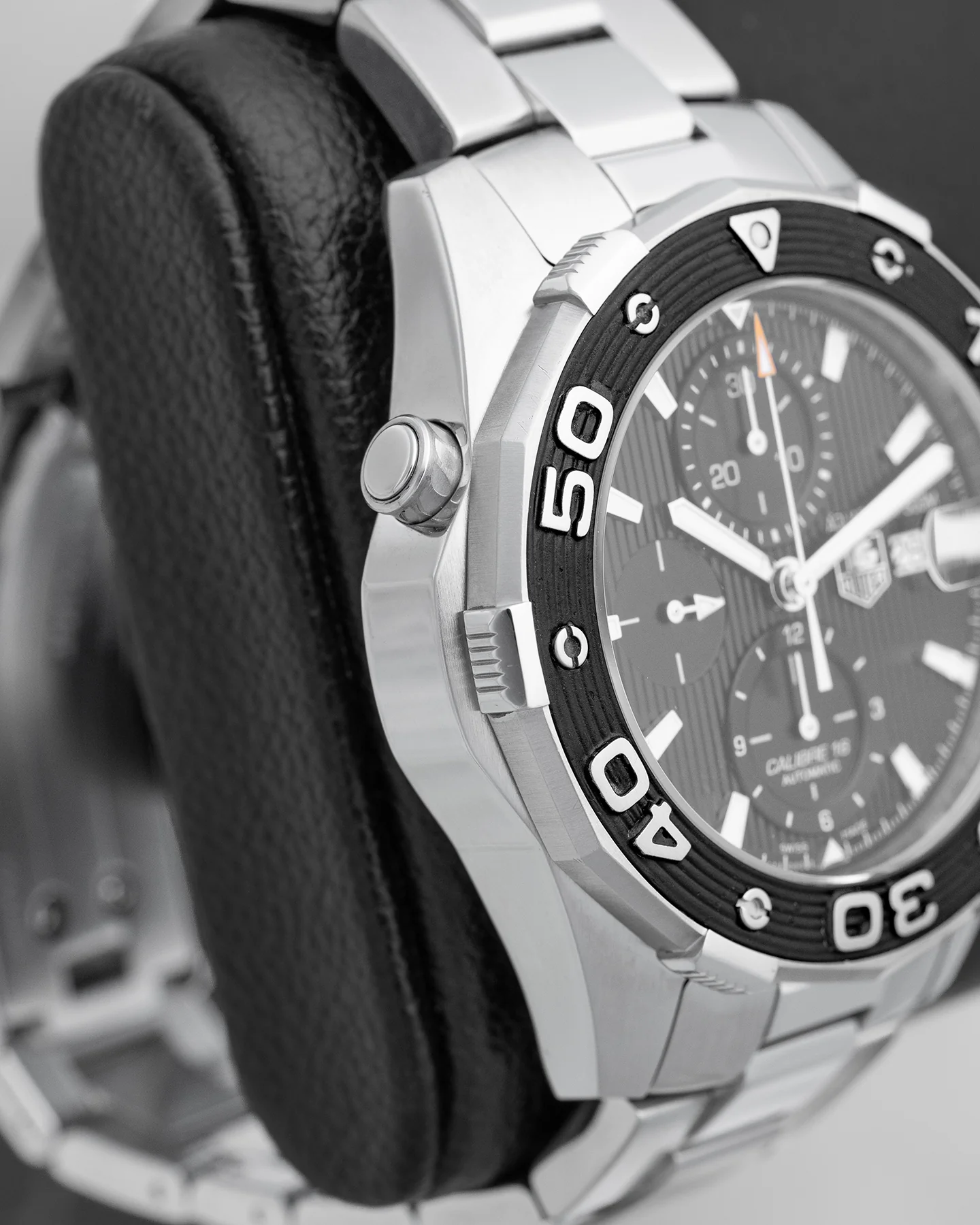 The TAG Heuer Aquaracer CAJ2110.BA0872 is the type of sport watch that doesn’t feel like a compromise. It’s tough, thanks to a 44mm stainless steel case and 500-meter depth rating, but still polished enough to wear to dinner. You get a classic black dial with three sub-dials, bold lume and that orange-tipped chronograph hand for a little edge. The Calibre 16 movement keeps it ticking smoothly. For fans of functional but refined TAG Heuer watches, this one delivers.