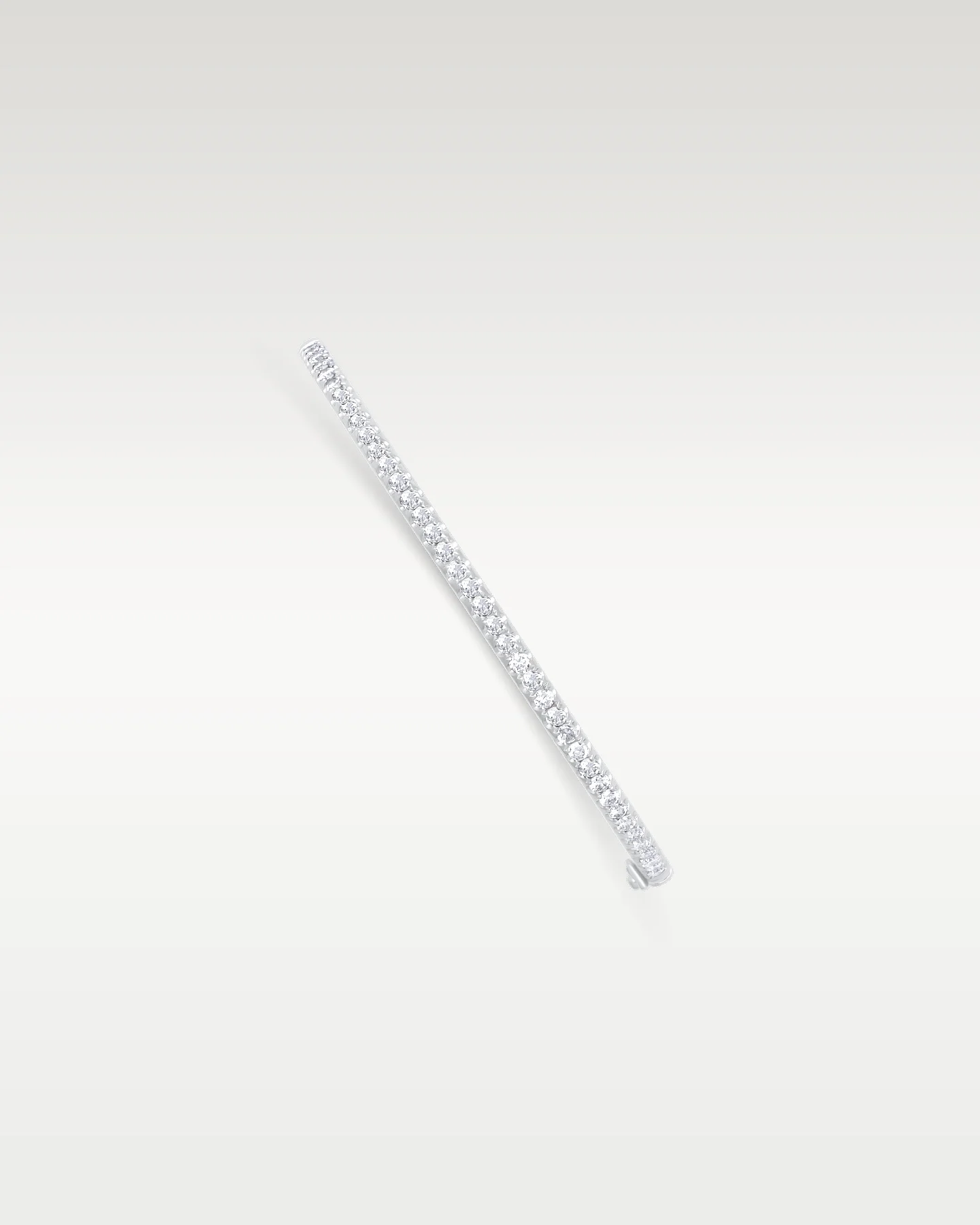 This diamond bangle, set in 18k white gold with 1.00 carat of round diamonds, offers a balance of elegance and versatility. Its thin clasp band allows for effortless layering with tennis or chain bracelets while maintaining a refined presence on its own.